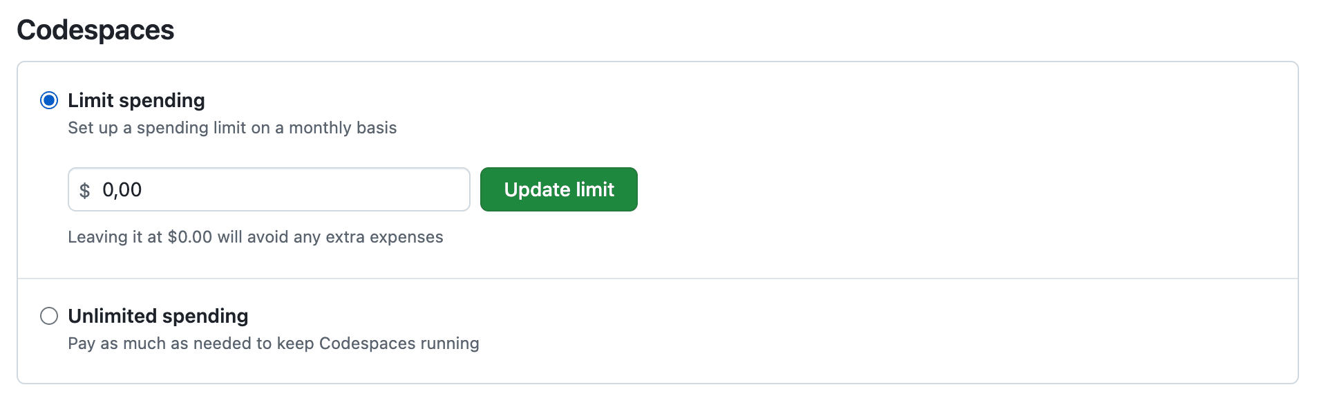 - Set a budget or limitation on Codespace usage to prevent unexpected fees. Leaving it at $0.00 will avoid any extra expenses.